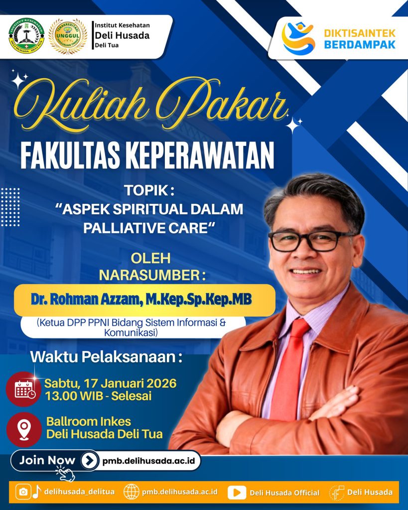 Fakultas Keperawatan Institut Kesehatan Deli Husada (IKDH) Deli Tua menyelenggarakan kegiatan Kuliah Pakar dengan topik “Aspek Spiritual dalam Palliative Care” pada Sabtu, 17 Januari 2026, bertempat di Ballroom Inkes Deli Husada Deli Tua. Kegiatan ini menghadirkan narasumber Dr. Rohman Azzam, M.Kep., Sp.Kep.MB, selaku Ketua DPP PPNI Bidang Sistem Informasi dan Komunikasi, yang memberikan pemaparan mendalam